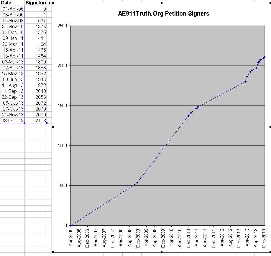 The first signer was Richard Gage in April of 2006. Like most people, for 4.5 years, he believed the Official Conspiracy Theory (OCT). Since then, the number of Petition signers has grown quickly. The following graph shows the growth since September 11, 2001.