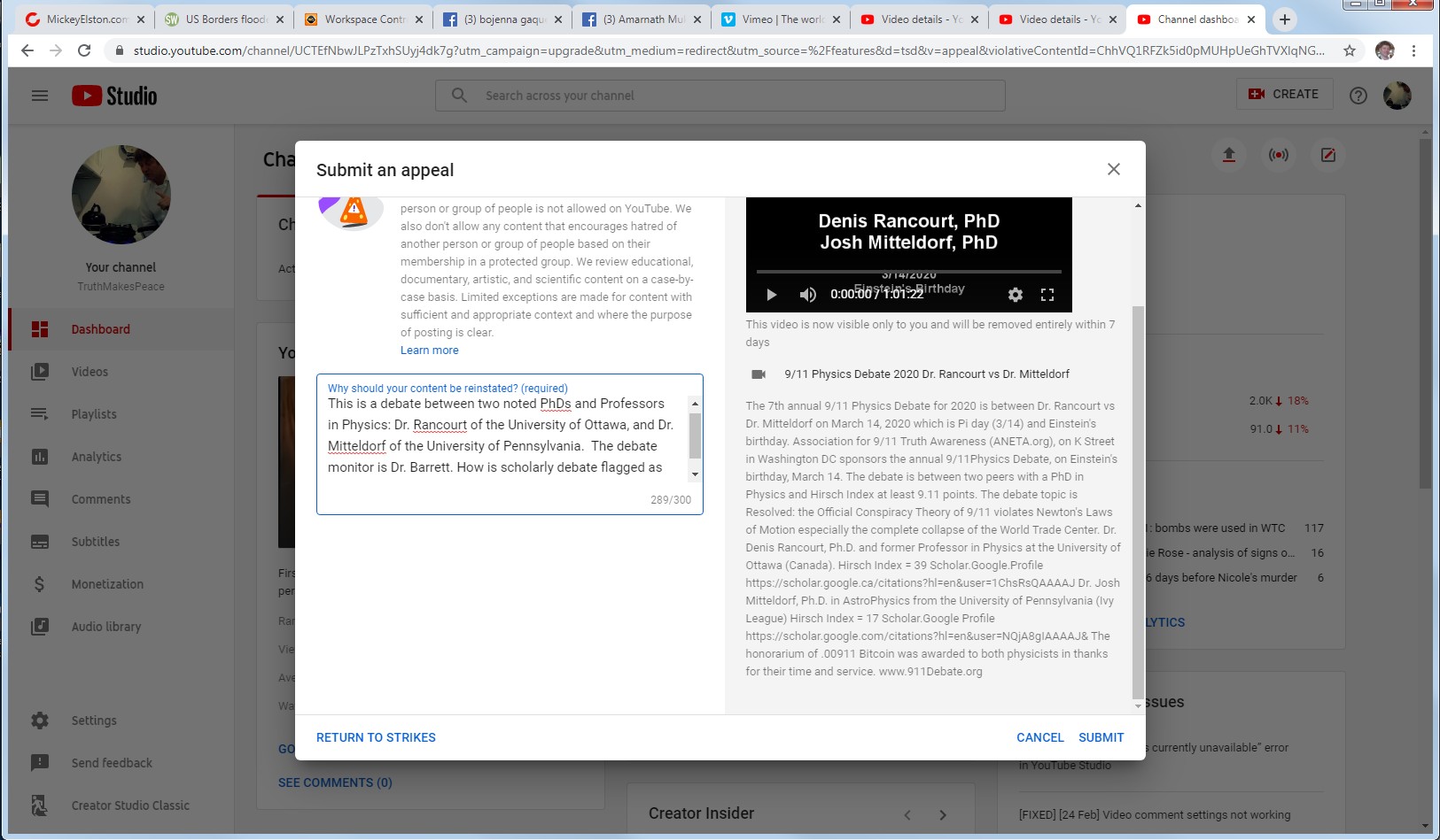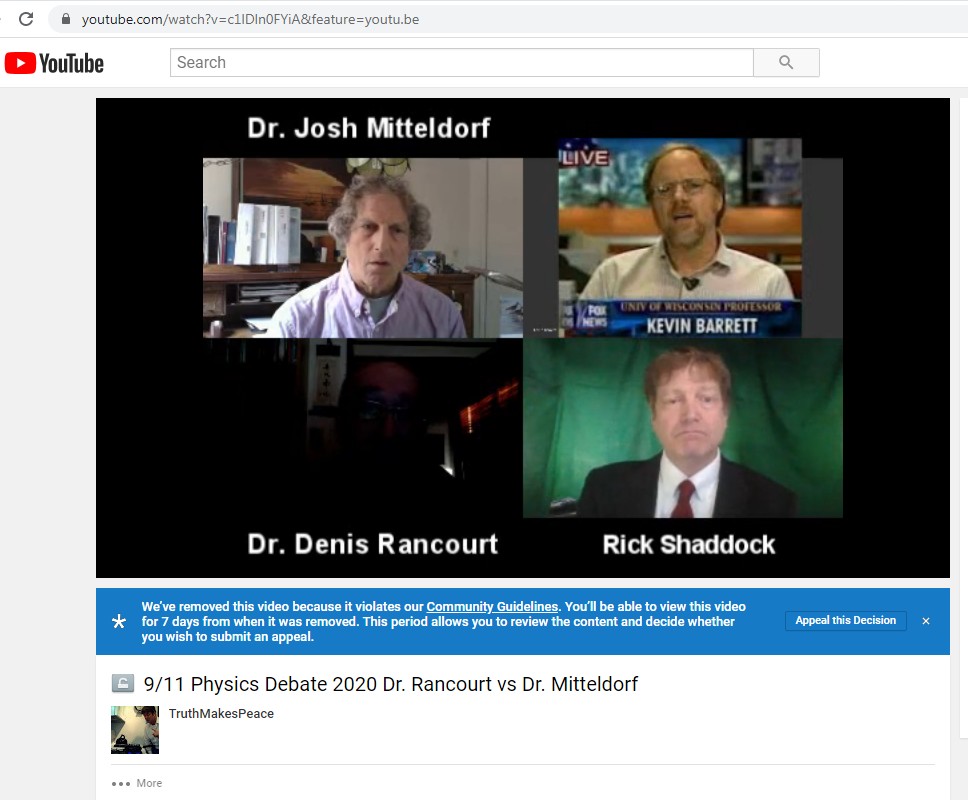 Your video 9/11 Physics Debate 2020 Dr. Rancourt vs Dr. Mitteldorf was removed